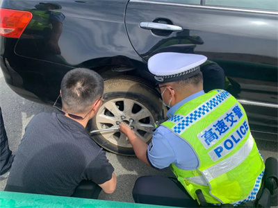 民警見狀立即啟動(dòng)警笛以提醒過往車輛,并迅速在車后方設(shè)置安全標(biāo)志。做好現(xiàn)場警戒后,巡邏民警利用車上工具幫助司機(jī)更換輪胎,經(jīng)過一番努力后,成功幫助司機(jī)更換了漏氣輪胎,及時(shí)消除了道路安全隱患。