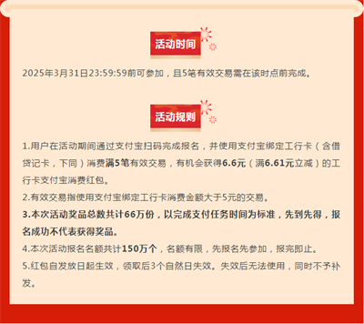 【多刷有禮】支付寶綁定工行卡消費(fèi)達(dá)標(biāo)有機(jī)會(huì)得消費(fèi)紅包!