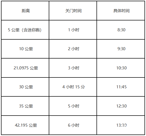 5、關(guān)門距離和時(shí)間(以起跑槍聲為準(zhǔn)):為了保證參賽運(yùn)動(dòng)員比賽安全、順利,限時(shí)對(duì)社會(huì)交通封閉。比賽期間比賽路線各段設(shè)關(guān)門時(shí)間,關(guān)門時(shí)間過后,相應(yīng)路段恢復(fù)社會(huì)交通。在規(guī)定關(guān)門時(shí)間內(nèi),未跑完對(duì)應(yīng)距離的運(yùn)動(dòng)員須立即停止比賽,退出賽道,以免發(fā)生危險(xiǎn)。退出比賽的運(yùn)動(dòng)員可搭乘組委會(huì)提供的收容車到相應(yīng)項(xiàng)目的終點(diǎn)處。