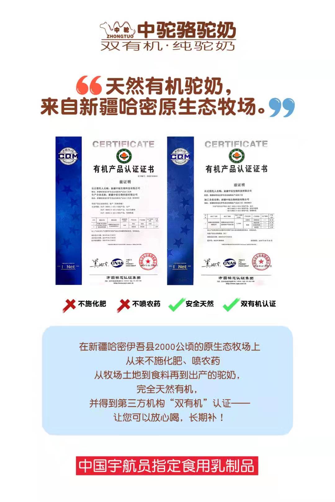 中駝?駱駝奶來自新疆哈密有機荒漠牧場,雙有機認證、不含過敏原、100%無添加、中駝公司承諾只做純正駱駝奶,如檢測出任何添加公司獎勵100萬。