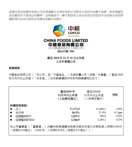 3月24日,中糧可口可樂大股東中國食品有限公司(下稱“中國食品”或“公司”,股票代碼:00506.HK)發(fā)布截至2019年12月31日的全年業(yè)績報告。報告期內,中國食品銷售總額171.72億元(單位:人民幣,下同),同比增長9.7%,超額完成業(yè)績目標,凈利潤同比勁增30.2%至4.18億元,毛利率同比提升1.1個百分點至36.5%。
