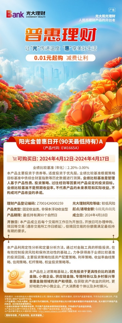 近日,光大銀行各渠道正式上線由光大理財(cái)管理發(fā)行的普惠金融主題產(chǎn)品——陽(yáng)光金普惠日開(kāi)(90天最低持有)A,繼續(xù)豐富光大銀行、光大理財(cái)?shù)钠栈萁鹑诋a(chǎn)品貨架。