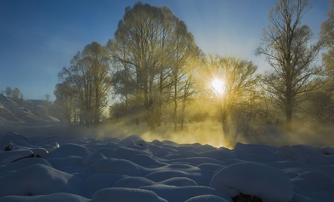 不凍河的神奇之處是,處于高寒地區(qū)的阿爾山每到冬季,滴水成冰,冰凍三尺??勺呓@段河流便頓覺來到了世外桃源,河中水流潺潺,氤氳蒸騰;兩岸的樹木冰清玉潔,枝椏晶瑩;就連樹下的枯草也潔白剔透,充滿了靈性;再看河床水中裸露的巖石,像裹上了一層厚厚的棉絮,一朵朵、一簇簇,如動(dòng)物似蘑菇……,各式造型可讓你充分展開想像的翅膀暢游其間、樂在其中。