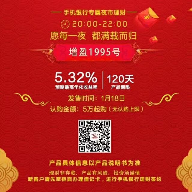 1月18日,華夏銀行手機銀行專屬“發(fā)財夜”理財產(chǎn)品如期而至,5款產(chǎn)品笑傲寒冬,總有一款適合您!