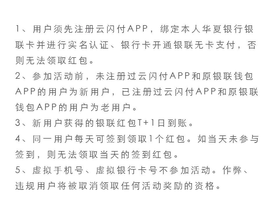 活動期間,第一次在云閃付APP完成注冊并綁定本人華夏卡實(shí)名認(rèn)證后,在一周內(nèi)使用云閃付APP完成一筆二維碼交易,即可獲得金額隨機(jī)的銀聯(lián)紅包獎勵(lì),最高88元。在云閃付APP內(nèi),每天均可點(diǎn)擊首頁簽到動態(tài)圖進(jìn)入活動頁面,點(diǎn)擊“簽到”領(lǐng)取紅包,紅包金額隨機(jī),最高88元。